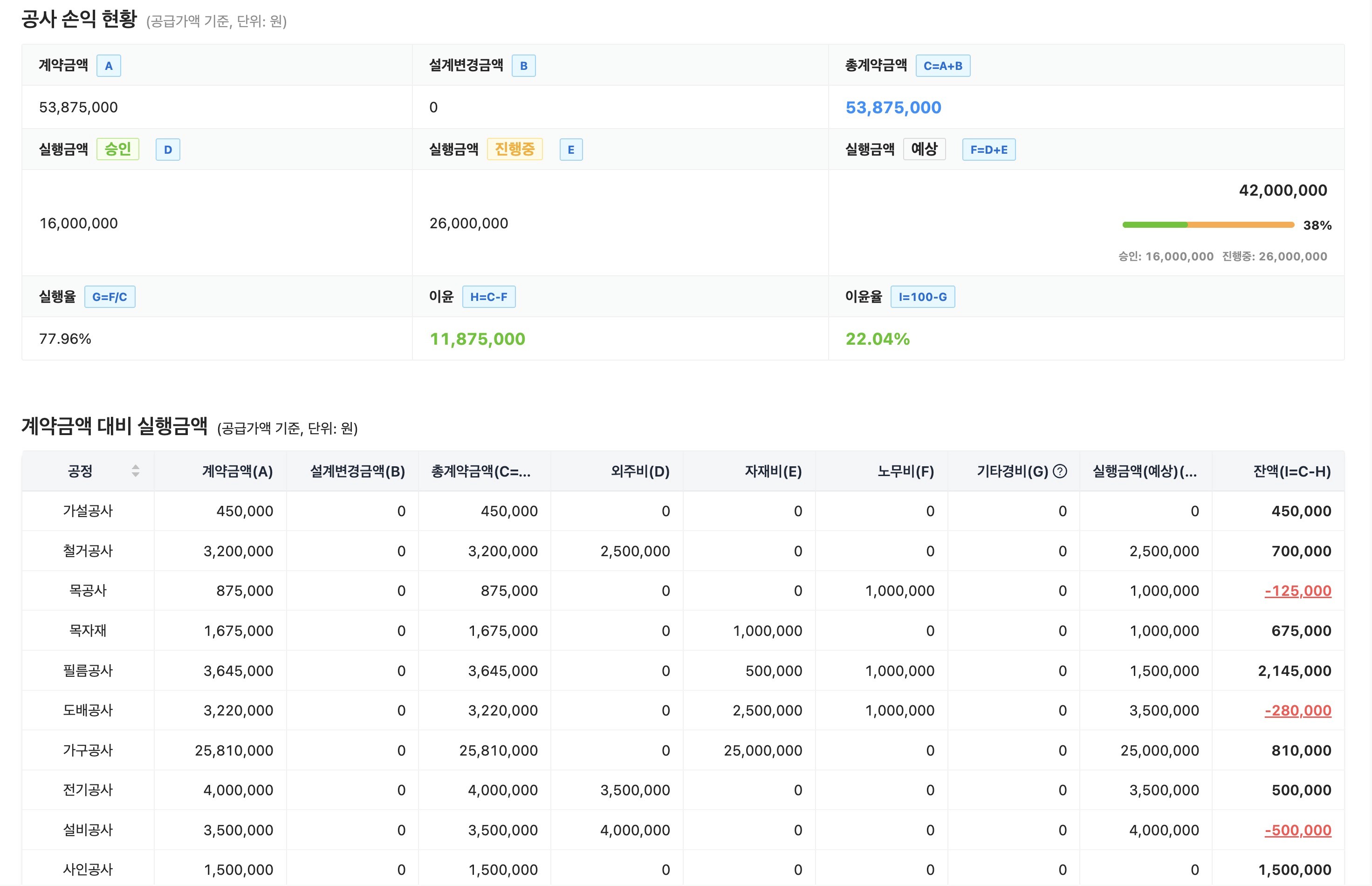 또한 현장별 손익, 미지급 현황을 한눈에 볼 수 있습니다.